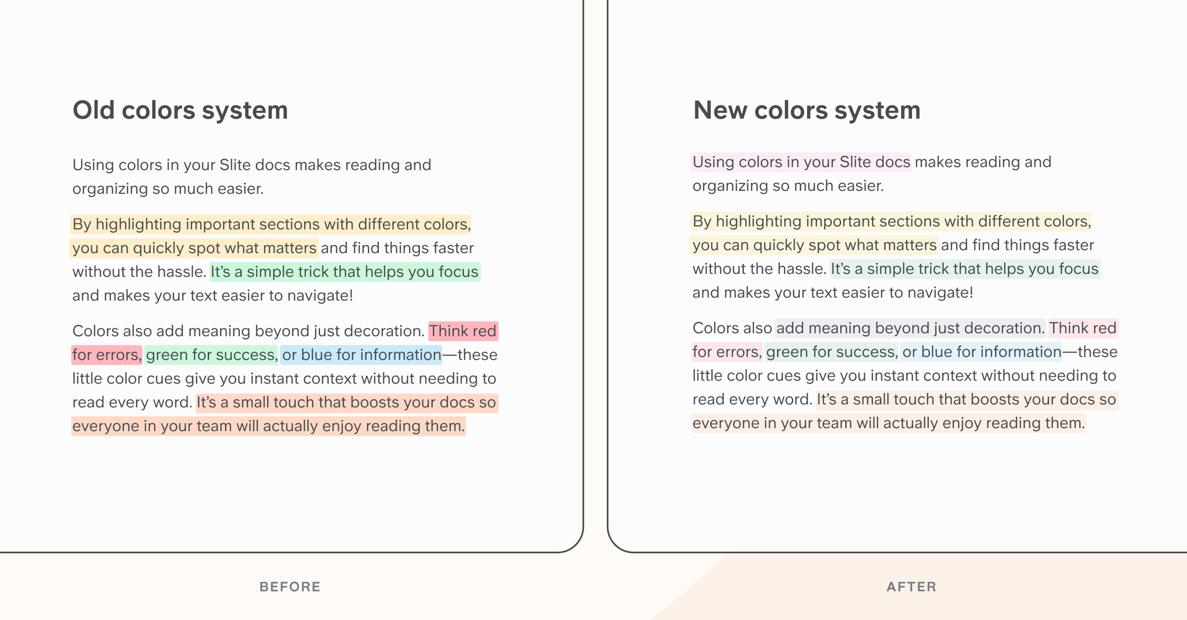Our editor is designed to make your docs beautiful by default. Colors can ruin that (cough cough Word docs), so we have put extreme care on this one. Hit cmd+E or use the toolbar option to add carefully picked colors to your text!