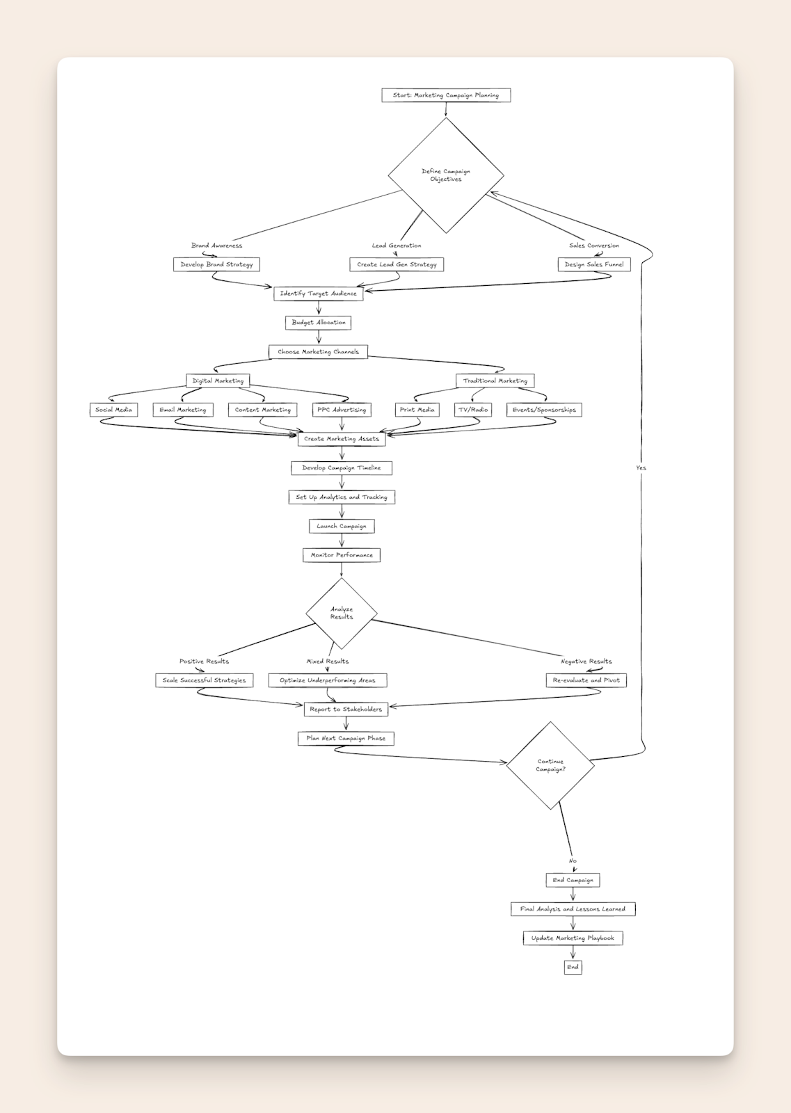 Excalidraw’s AI generated the comprehensive flowchart covering everything from campaign objectives and marketing channels to performance analysis and stakeholder reporting, demonstrating its impressive ability to understand and visualize complex business processes.