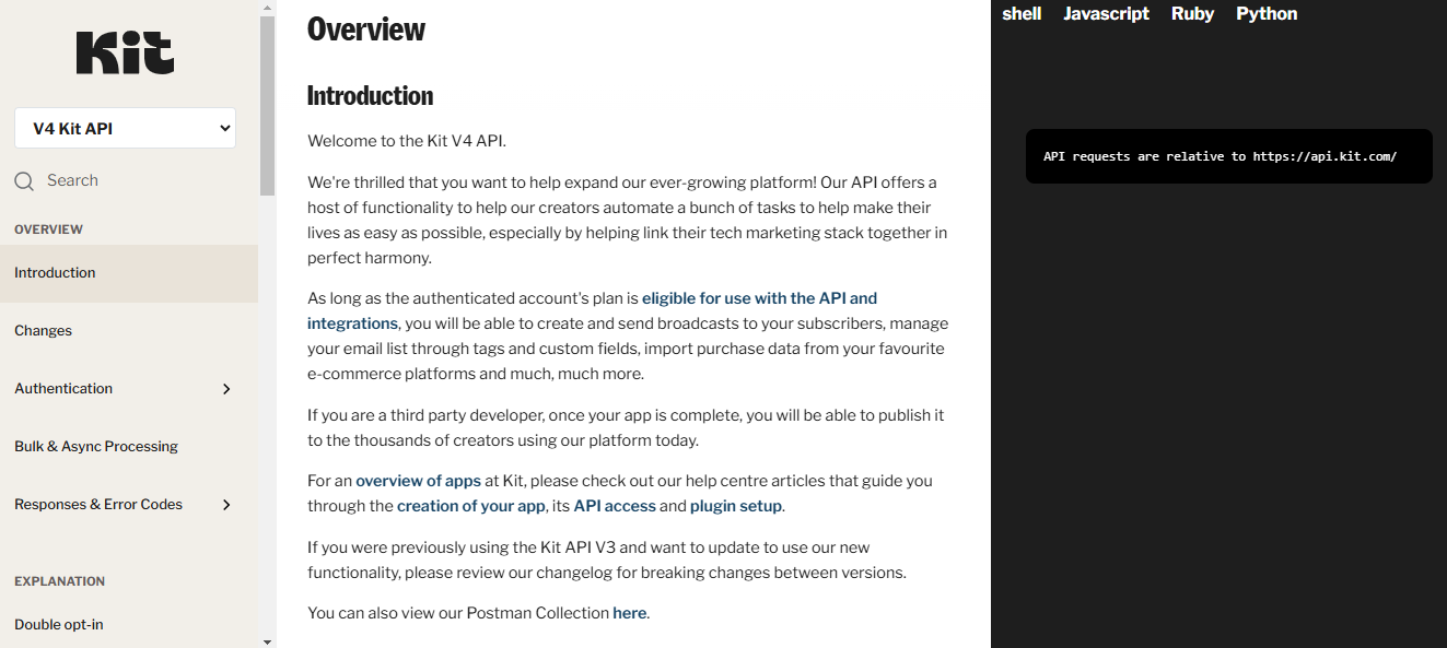 For instance, Kit API documentation includes a brief overview and sections like changes, authentication, OAuth, API Keys and more.
